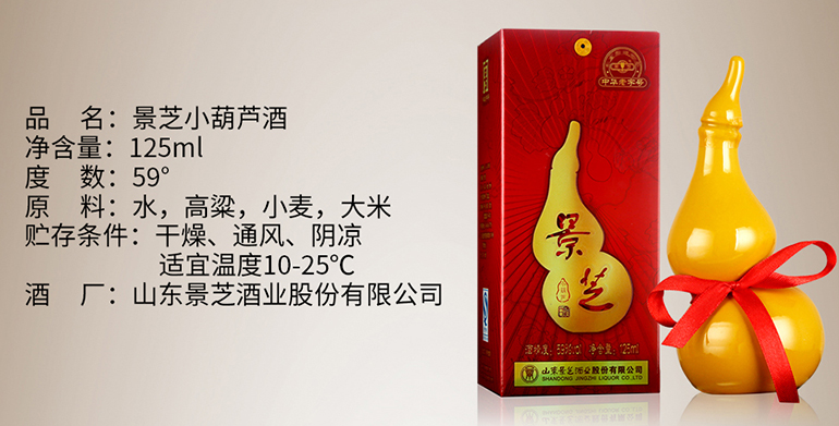 59度景芝小葫蘆125ml(6瓶裝),由景芝出品,生產(chǎn)廠家是山東景芝酒業(yè)股份有限公司,采用水、高粱、小麥等為原料,在景芝白酒中口碑較好。