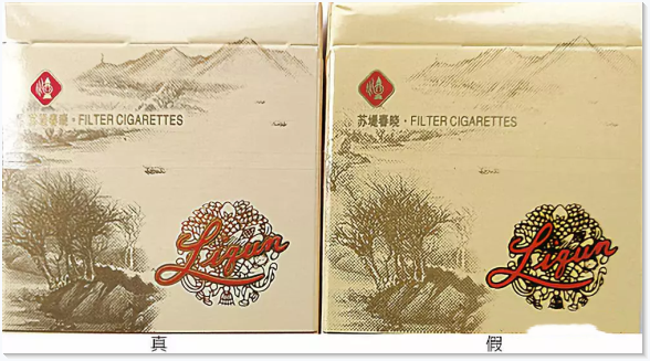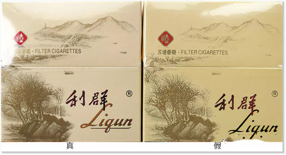 1.正面商標紙印刷工藝差異對比:真品商標紙采用膠印印刷,中間“利群”文字及拼音采用壓凸?fàn)C金工藝,用手摸凹凸感明顯,“蘇堤春曉”主體圖案顏色較深;假煙采用高清掃描仿制印刷,中間“利群”文字及拼音用手摸無凹凸感,“蘇堤春曉”主體圖案顏色較淡,商標紙整體顏色偏黃。