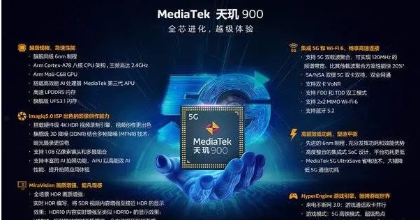 拍照方面,天璣900支持MediaTek Imagiq 5.0圖像處理技術(shù),提供有多核ISP以及硬件級的4K HDR視頻錄制引擎,支持3D降噪(3DNR)和多幀降噪(MFNR)技術(shù),最高支持1.08億像素四攝組合。