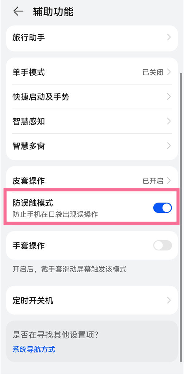 2、進(jìn)入輔助功能設(shè)置頁面后,將【防誤觸模式】右側(cè)的開關(guān)開啟即可。