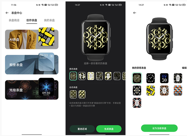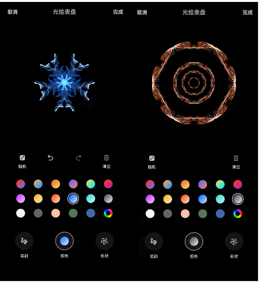 同時,OPPO Watch 2還新增了光繪表盤,在與手機(jī)連接的情況下,可在手機(jī)上進(jìn)行繪制,可選擇不同顏色、筆刷、形狀,當(dāng)然也可以直接隨機(jī)生成圖案。此外還有動態(tài)表盤、相冊表盤,可玩性還是非常高的。