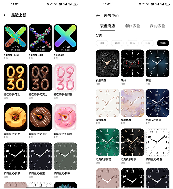 很多人選擇智能手表的一大樂趣就是有眾多表盤,有時候換個表盤有種換新手表的錯覺。OPPO Watch 2內(nèi)置表盤商店,擁有包括健康、效率、趣味、藝術(shù)和經(jīng)典等100+表盤,完全能夠滿足大家的需求。