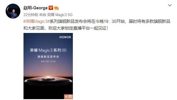榮耀Magic3系列新品發(fā)布會(huì)將于今晚(8月12日)19:30正式舉行,現(xiàn)在官方已經(jīng)公布了發(fā)布會(huì)的直播平臺(tái)。榮耀終端有限公司CEO趙明表示,屆時(shí)將有多款旗艦新品和大家見(jiàn)面,歡迎大家一起見(jiàn)證!