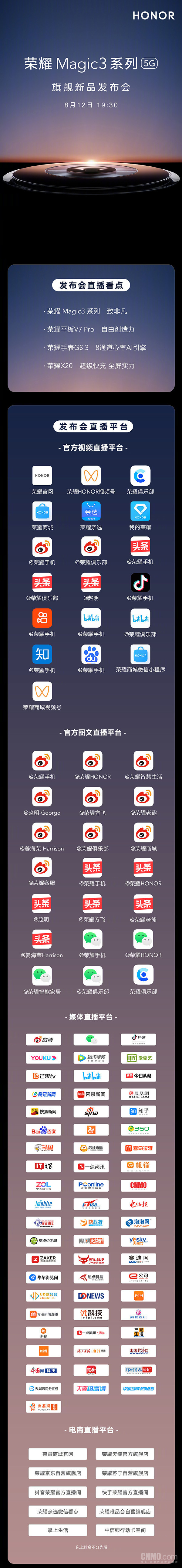 官方視頻直播平臺(tái)包括榮耀官網(wǎng)、榮耀商城、榮耀親選、@榮耀手機(jī) 微博、@榮耀俱樂(lè)部 微博以及榮耀手機(jī) 頭條號(hào)、榮耀手機(jī) 抖音號(hào)、榮耀手機(jī) 嗶哩嗶哩號(hào)等;官方圖文直播平臺(tái)主要集中在微博、今日頭條以及微信平臺(tái),用戶可通過(guò)@榮耀手機(jī) 官微、@榮耀HONOR 官微、@榮耀智慧生活 等查看。其他媒體平臺(tái)有騰訊視頻、愛(ài)奇藝、騰訊新聞、CNMO等。此外,大家還可以通過(guò)榮耀商城官網(wǎng)、榮耀天貓官方旗艦店以及榮耀京東/蘇寧自營(yíng)旗艦店等電商平臺(tái)觀看此次發(fā)布會(huì)。