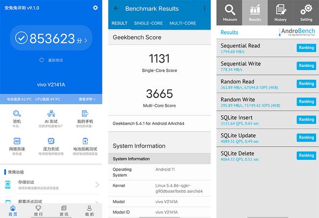 安兔兔跑分達(dá)到85萬+,單核成績1131分,多核成績3665,順序讀取分別為1794.68MB/s,寫入778.24MB/s,成績都是目前頂尖。